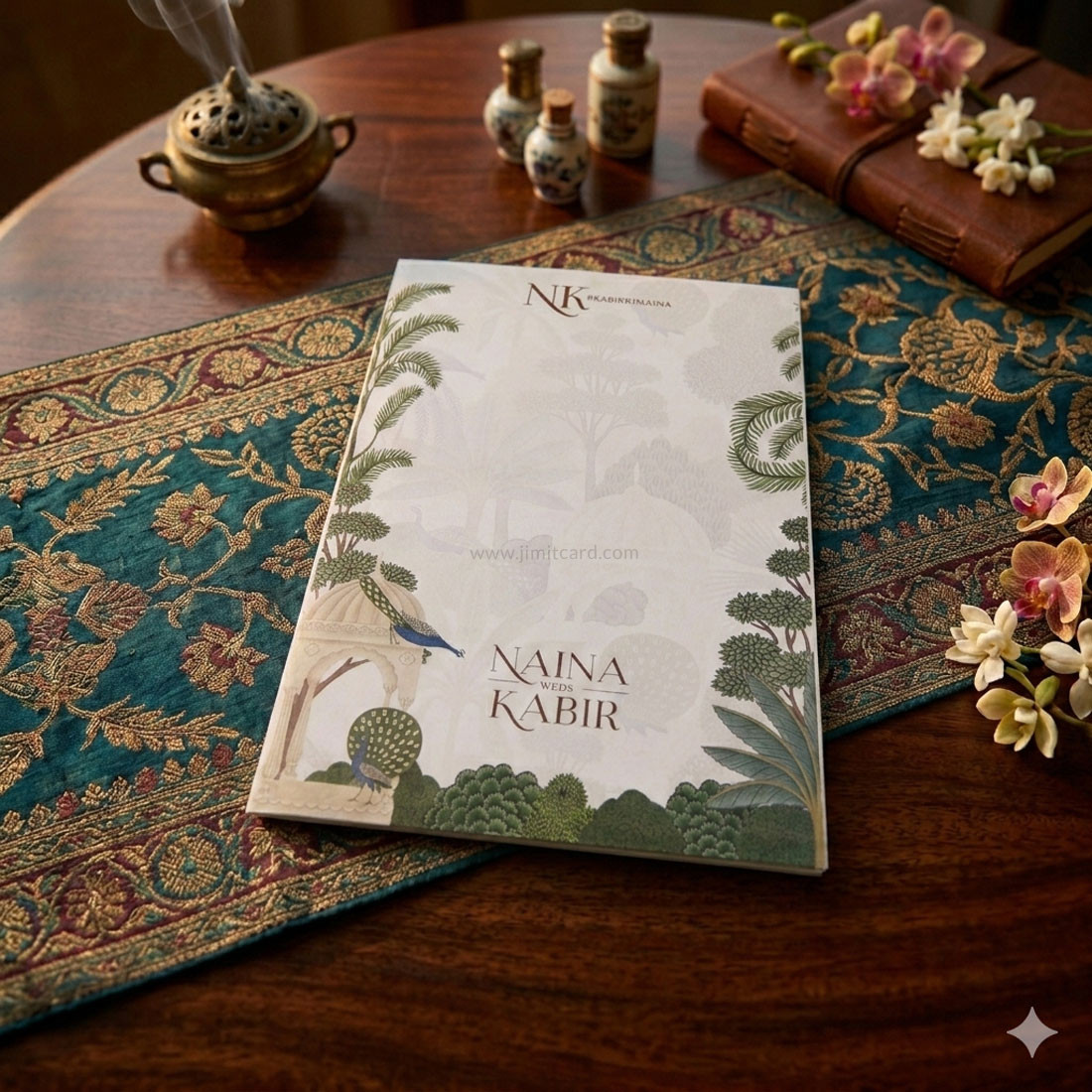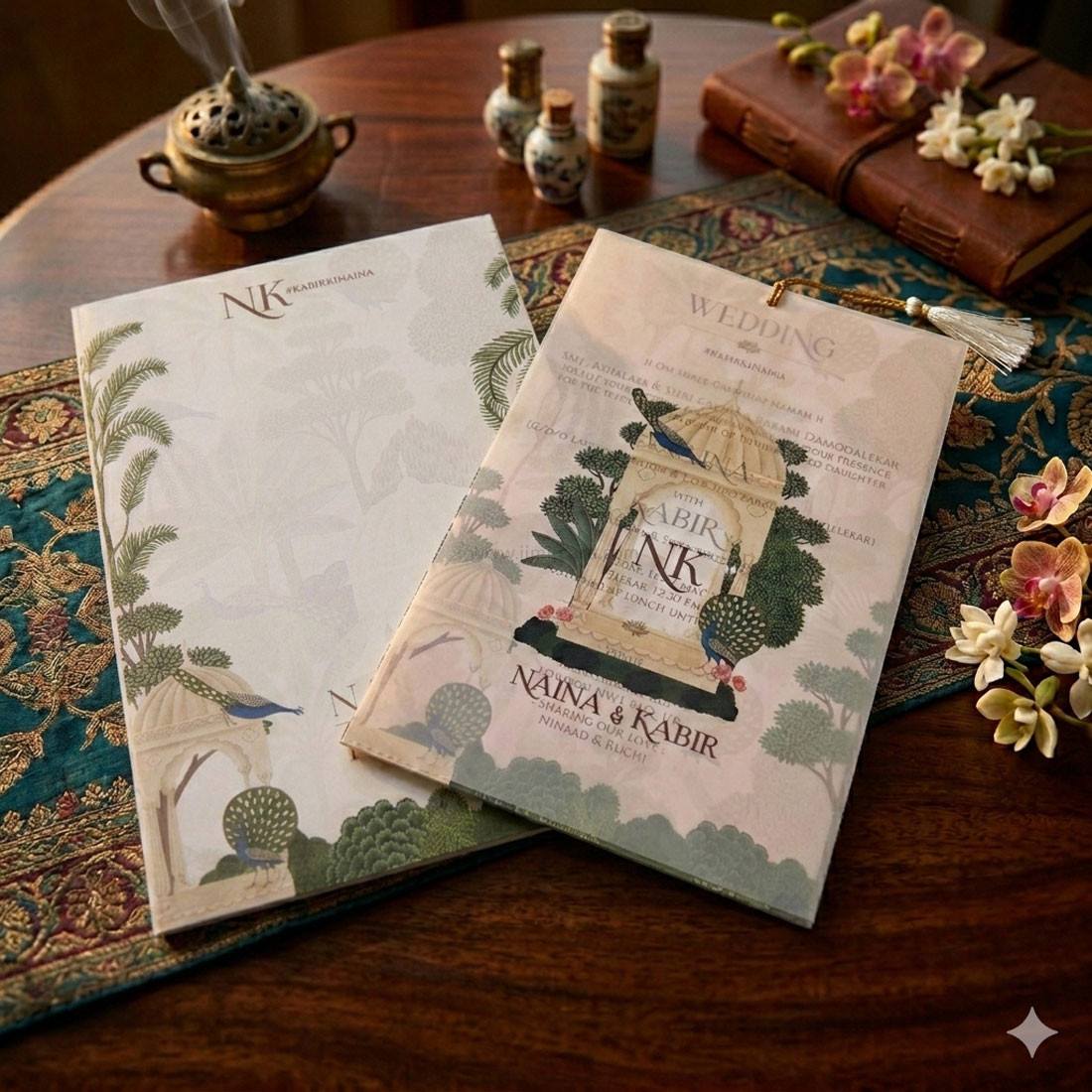Artistic Overlay: A premium vellum (translucent) sheet featuring the central Jharokha and peacock artwork adds a layer of depth and sophistication to the invitation.